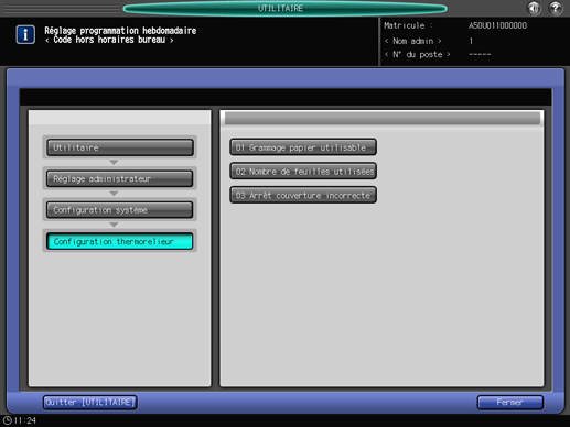 Appuyez sur l'onglet [Configuration système] de l'écran [Menu fonctions administrateur] et appuyez successivement sur [Configuration thermorelieur] et [Arrêt couverture incorrecte].