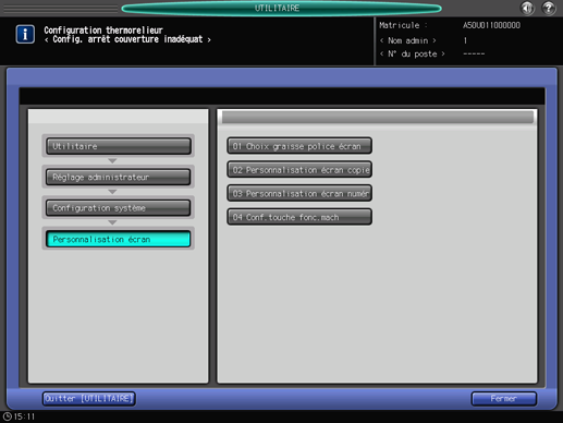 Appuyez sur l'onglet [Configuration système] de l'écran [Menu fonctions administrateur] et appuyez successivement sur [Personnalisation écran] et [Personnalisation écran numér].