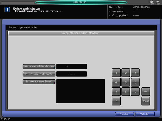 Enregistrez le nom de l'administrateur et le numéro de poste à afficher dans le coin supérieur droit de l'écran [UTILITAIRE]. Enregistrez également l'adresse e-mail de l'administrateur.