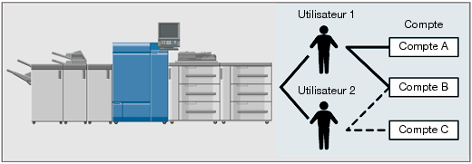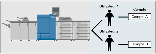 Cette configuration système convient pour suivre les utilisateurs individuels gérés par chaque département lorsque l'utilisation de la machine est partagée entre plusieurs départements. Quand cette configuration est active, la machine permet de consigner les statistiques concernant à la fois chaque employé (ou chaque utilisateur) et chaque département (chaque compte).