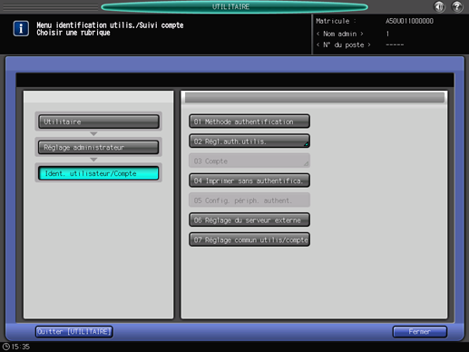 Sélectionnez une touche à droite des éléments suivants : [Authentificat. utilisateur], [Utilisateur public], [Compte], [Méthode saisie suivi compte] et [Connexion auth. compte/util.].
