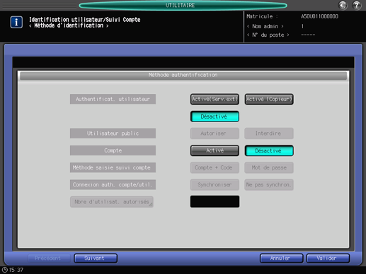 Pour annuler la modification, appuyez sur [Annuler]. Dans tous les cas, l'écran [Menu Identification utilis./Suivi compte] réapparaît.