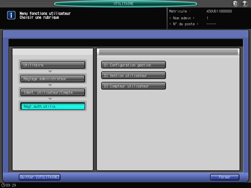 Appuyez sur l'onglet [Ident. utilisateur/Compte] de l'écran [Menu fonctions administrateur], puis appuyez successivement sur [Régl.auth.utilis.] et [Compteur utilisateur].