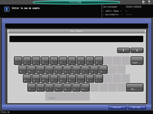 Appuyez sur [Nom compte] pour afficher l'écran [Saisie nom du compte]. Entrez le nom de compte souhaité. Vous pouvez entrer un maximum de 8 caractères à un octet pour le nom de compte. Pour en savoir plus sur la saisie des caractères, voir Saisie des caractères.