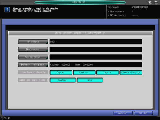 Utilisez cette fonction pour affecter un numéro à chaque compte et définissez les champs Nom de compte, Mot de passe, Définir limite max., Fonction utilisable et Permission Sortie pour chaque numéro de compte.
