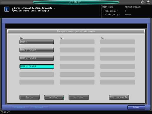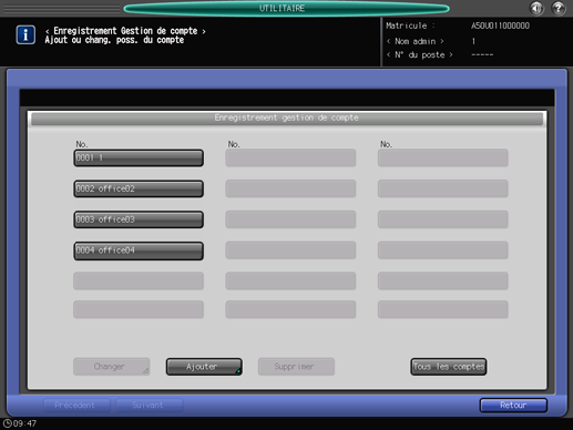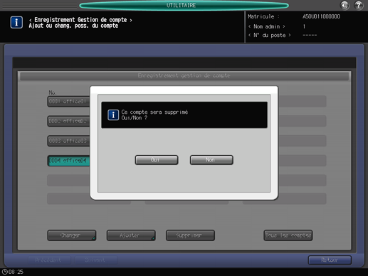 Appuyez sur [Oui] pour confirmer le changement et revenir à l'écran [Enregistrement gestion de compte]. Si vous sélectionnez [Non], vous retournez sur l'écran [Changer tous les comptes]. Pour revenir à l'écran [Enregistrement gestion de compte], appuyez sur [Annuler].