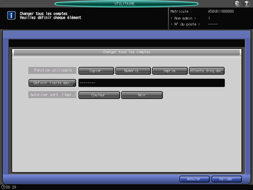 Modifiez Fonction utilisable, Définir limite max. et Permission Sortie collectivement pour tous les comptes.