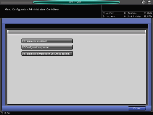 Dans le cas où le contrôleur d'image IC-602 n'est pas installé sur la machine, la touche [Contrôleur] de l'écran [Menu fonctions administrateur], accessible depuis l'écran [UTILITAIRE], est estompée et inactive.