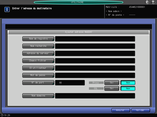 [N° de port] | Entrez un numéro de port utilisé par un serveur WebDAV. Entrez 5 chiffres (00001 à 65535). Le réglage par défaut est 80. Aucune configuration n'est requise dans des conditions normales. Contactez l'administrateur du réseau au sujet du numéro de port. |