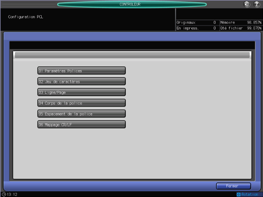 Cet écran s'affiche si vous sélectionnez [Paramètre Impression Directe] - [Configuration PCL] sur l'écran [Menu Configuration Contrôleur Machine]. Pour en savoir plus sur l'affichage de l'écran [Menu Configuration Contrôleur Machine], voir CONTRÔLEUR : réglage du contrôleur.