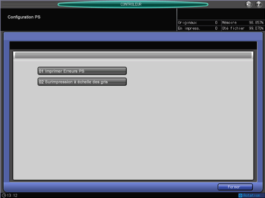Cet écran s'affiche si vous sélectionnez [Paramètre Impression Directe] - [Configuration PS] sur l'écran [Menu Configuration Contrôleur Machine]. Pour en savoir plus sur l'affichage de l'écran [Menu Configuration Contrôleur Machine], voir CONTRÔLEUR : réglage du contrôleur.