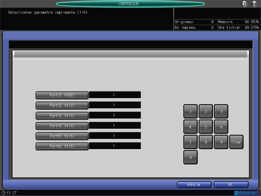 [Port1( 9100)] à [Port6( 9116)] | Spécifie la sortie de chaque port (numéro de paramètre 1 à 6). Entrez un numéro de port et appuyez sur [OK]. Pour annuler la modification, appuyez sur [Annuler]. |