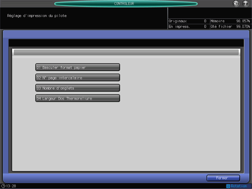 Cet écran s'affiche si vous sélectionnez [Réglage d'impression du pilote] sur l'écran [Menu Configuration Contrôleur Machine] . Pour en savoir plus sur l'affichage de l'écran [Menu Configuration Contrôleur Machine], voir CONTRÔLEUR : réglage du contrôleur.