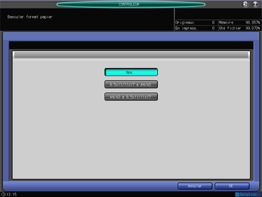 Cet écran s'affiche si vous sélectionnez [Réglage d'impression du pilote] - [Basculer format papier] sur l'écran [Menu Configuration Contrôleur Machine]. Pour en savoir plus sur l'affichage de l'écran [Menu Configuration Contrôleur Machine], voir CONTRÔLEUR : réglage du contrôleur.