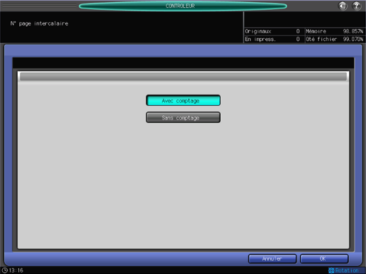 Cet écran s'affiche si vous sélectionnez [Réglage d'impression du pilote] - [N° page intercalaire] sur l'écran [Menu Configuration Contrôleur Machine]. Pour en savoir plus sur l'affichage de l'écran [Menu Configuration Contrôleur Machine], voir CONTRÔLEUR : réglage du contrôleur.