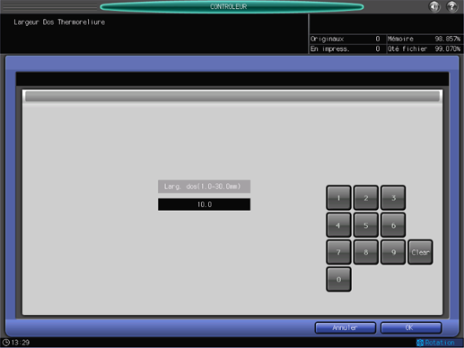 Cet écran s'affiche si vous sélectionnez [Réglage d'impression du pilote] - [Largeur Dos Thermoreliure] sur l'écran [Menu Configuration Contrôleur Machine]. Pour en savoir plus sur l'affichage de l'écran [Menu Configuration Contrôleur Machine], voir CONTRÔLEUR : réglage du contrôleur.