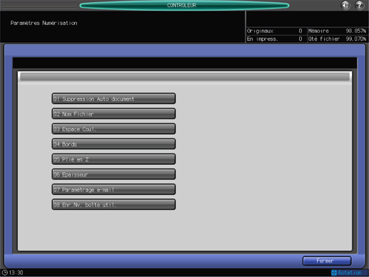 Cet écran s'affiche si vous sélectionnez [Configuration scanner] sur l'écran [Menu Configuration Contrôleur Machine] . Pour en savoir plus sur l'affichage de l'écran [Menu Configuration Contrôleur Machine], voir CONTRÔLEUR : réglage du contrôleur.