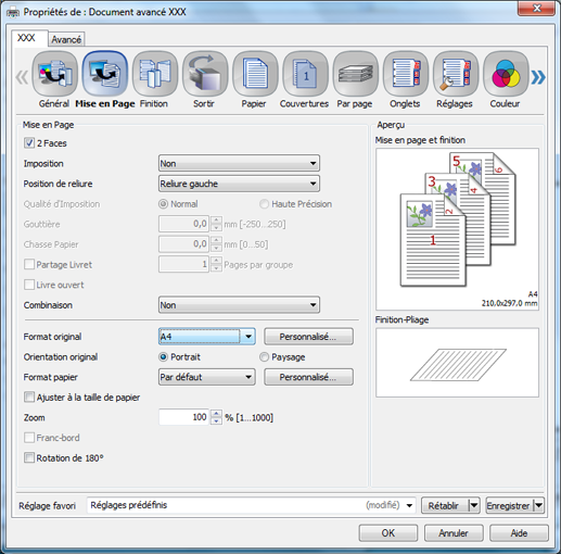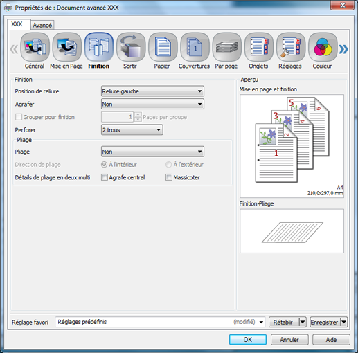 Lors de la configuration du pilote d'imprimante, assurez-vous d'avoir supprimé les réglages précédents des différents éléments des onglets [Mise en Page], [Finition], [Couvertures], etc.