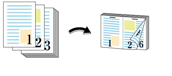 Impression sur les deux faces du papier et agrafage avec l'unité de finition. Cette section décrit l'impression pleine grandeur ainsi que l'impression 2 en 1 (impression réduite).
