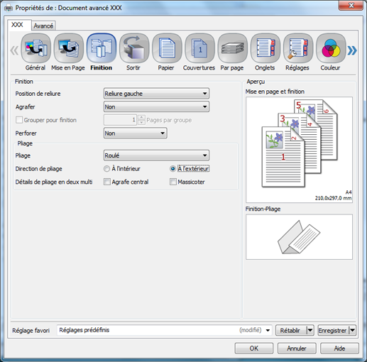 Cliquez sur l'onglet [Finition] et définissez [Pliage] et [Direction de pliage].