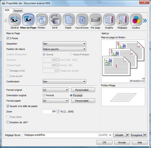 Lors de la configuration du pilote d'imprimante, assurez-vous d'avoir supprimé les réglages précédents des différents éléments des onglets [Mise en Page], [Finition], [Couvertures], etc.