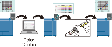 Mesurez la densité de sortie des couleurs C, M, J et N sur une charte à l'aide de l'instrument et retournez les résultats au contrôleur. Ce retour d'information est utilisé par le contrôleur pour exécuter l'étalonnage automatique de la densité de sortie en référence à la densité cible prédéfinie. Cet étalonnage active une densité de sortie proche de la densité cible.