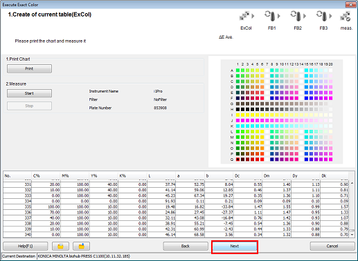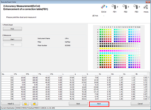 Mesurez la charte avec l'instrument. Une fois la mesure de la charte terminée, cliquez sur [Suivant].