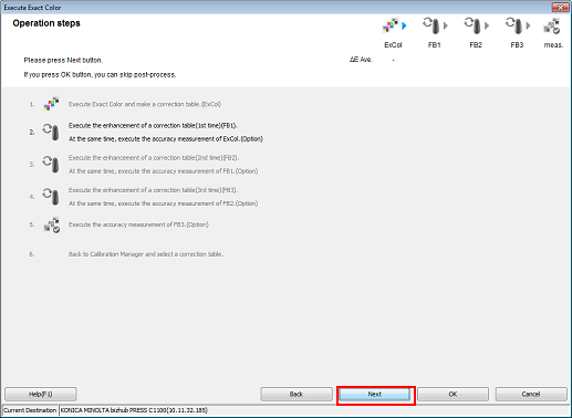 L’assistant d'exécution de la fonction Exact Color démarre et affiche l'écran [Etapes d'exécution].