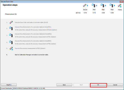 Une fois la [5. Mesure de la précision (FB3)] terminée, cliquez sur [OK] sur l'écran [Etapes d'exécution].