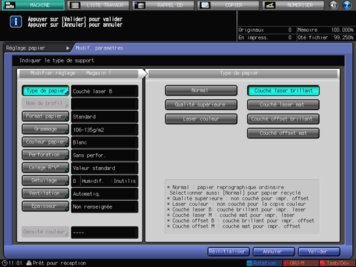 Exemple : Couché Laser B (A3) 128 g/m2 / 33 lb Bond chargé dans Magasin 1.