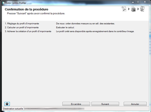 L'assistant Color Centro Profiler est lancé et affiche l'écran [Confirmation de la procédure].