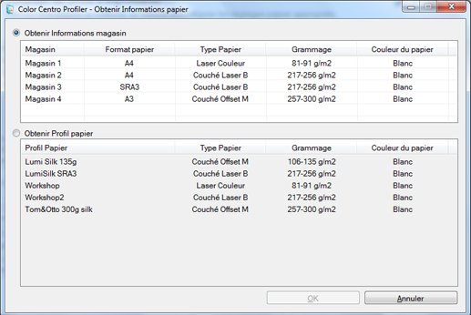 Sélectionnez [Obtenir Informations magasin] sur l'écran [Obtenir Informations papier]. Lorsque vous avez sélectionné le magasin contenant le papier, cliquez sur [OK].