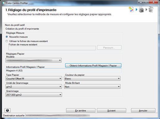 Sélectionnez [Nouvelle mesure] sous [Réglage Mesure] et cliquez sur [Obtenir Informations Profil Magasin / Papier].