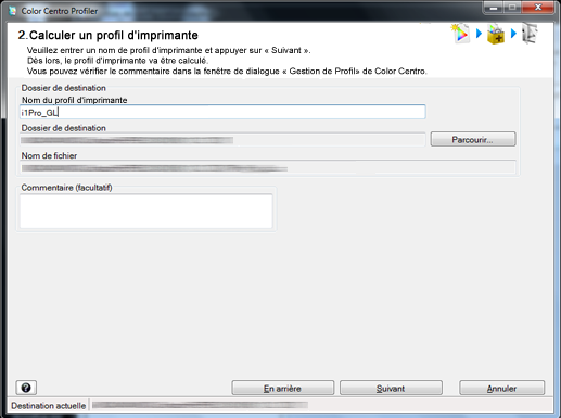 Entrez un nom de profil sous [Nom du profil d'imprimante]. Au besoin, spécifiez le [Dossier de destination] et cliquez sur [Suivant].