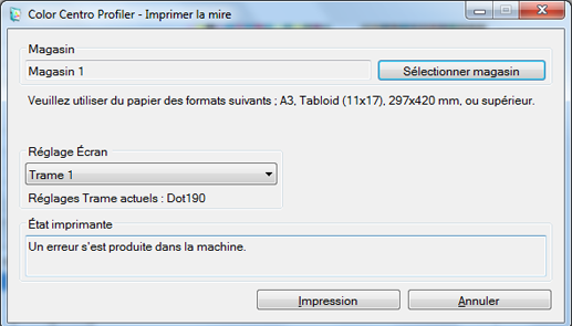 Définissez les éléments suivants sur l'écran [Imprimer la mire]. Après le réglage, cliquez sur [Impression].