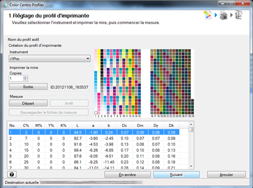 Lorsque vous avez terminé la mesure de la charte, cliquez sur la touche [Suivant] de l'écran [1.Réglage du profil d'imprimante].