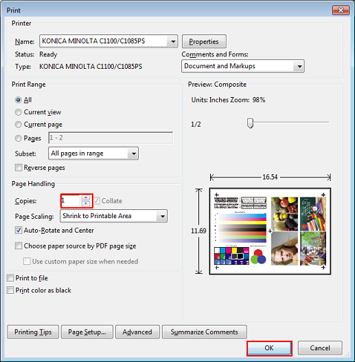 Sur l'écran [Impression], entrez les [Copies] et cliquez sur [OK]. Après l'impression, vérifiez les résultats.