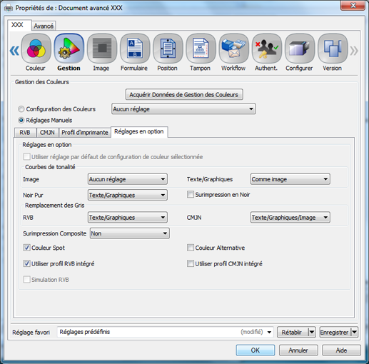 Cliquez sur [Réglages en option] et sélectionnez [Couleur Spot]. Cliquez sur [OK].
