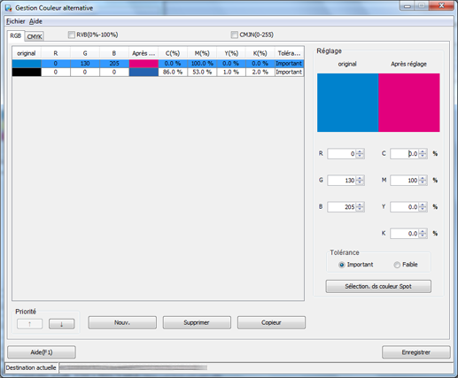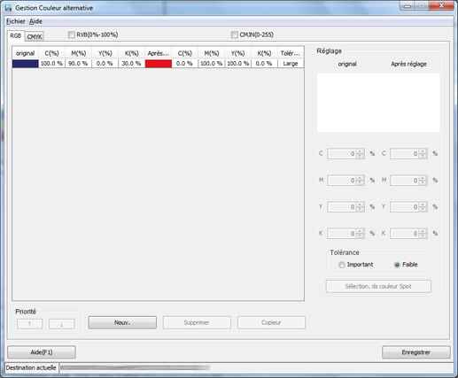 Les couleurs en cours de définition s'affichent sous [Réglage]. La couleur dans [original] indique la couleur RVB source tandis que la couleur mentionnée dans [Après réglage] indique la couleur alternative.