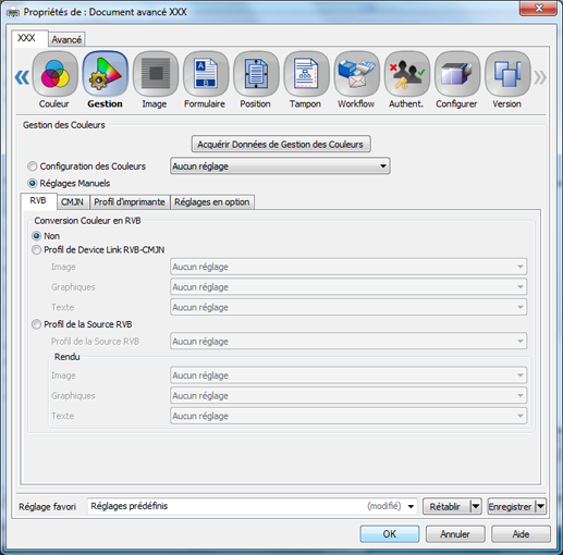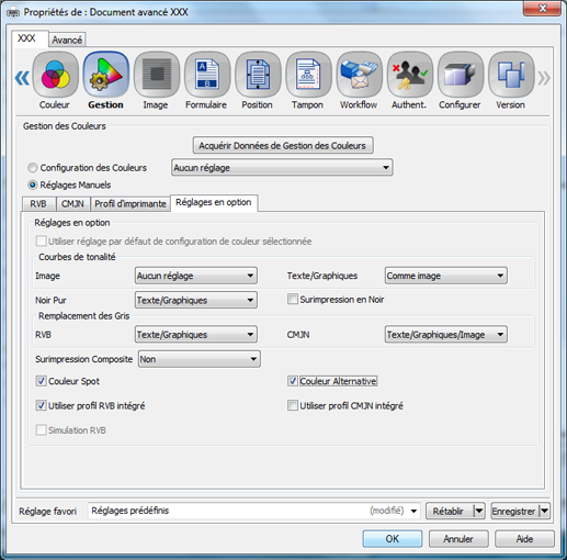 Il est recommandé d'enregistrer les réglages de sortie couleur fréquemment utilisés dans la configuration des couleurs. (Voir Qualité image : enregistrement de la configuration des couleurs