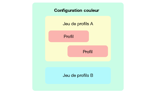 Enregistrez ensemble plusieurs jeux de profils, utilisés pour tous les types de papier pour l'impression d'une tâche spécifique ainsi que d'autres informations sur les réglages couleur en tant que "configuration couleur".