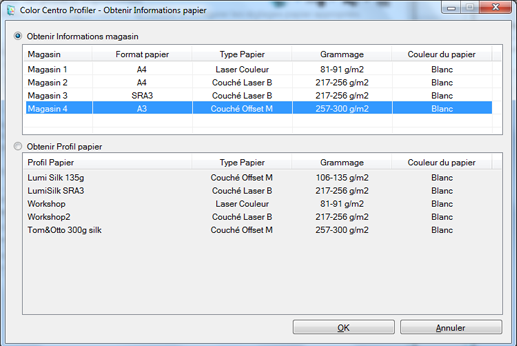 Exemple : cliquez sur [Obtenir Informations Profil Magasin / Papier] pour utiliser le réglage papier du magasin 3 (Couché laser B : (A3) 128 g/m2 / 33 lb Bond).