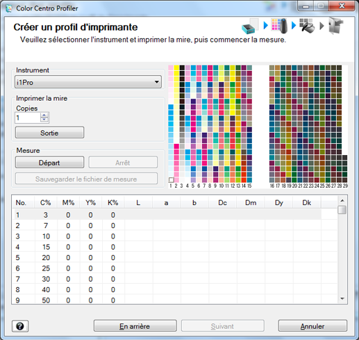 Lorsque vous avez terminé la mesure de la charte, cliquez sur la touche [Suivant] de l'écran [Créer un profil d'imprimante].