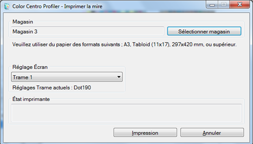 Sur l'écran [Imprimer la mire], définissez [Magasin] et [Réglage Ecran]. Après le réglage, cliquez sur [Impression].
