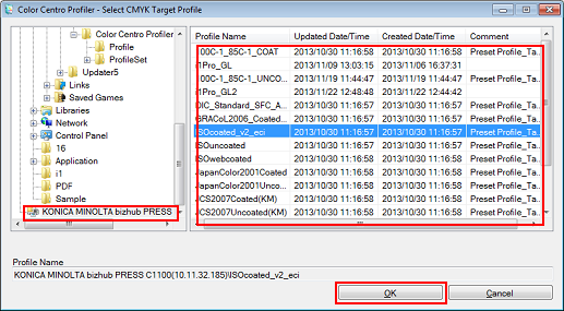 Sélectionnez un dossier à gauche, puis un profil de la cible CMJN dans la liste de droite. Cliquez sur [OK].