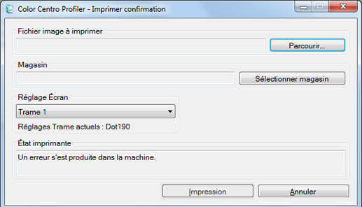 Sur l'écran [Imprimer confirmation], spécifiez le fichier d'image à imprimer, le magasin et la trame à utiliser. Après le réglage, cliquez sur [Impression].