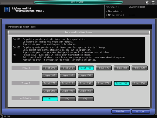Si une image est difficile à reproduire avec la trame actuelle (ou sélection auto), il est important de sélectionner la trame appropriée. Pour l’impression, vous avez le choix entre trois types de trame : [Trame 1], [Trame 2] et [Aléatoire]. Mais la trame attribuée à chaque type de trame ne peut être définie que par l'administrateur dans le menu [Réglage administrateur].