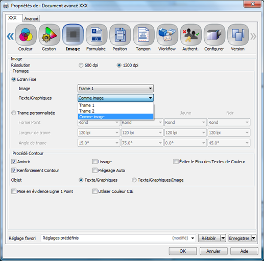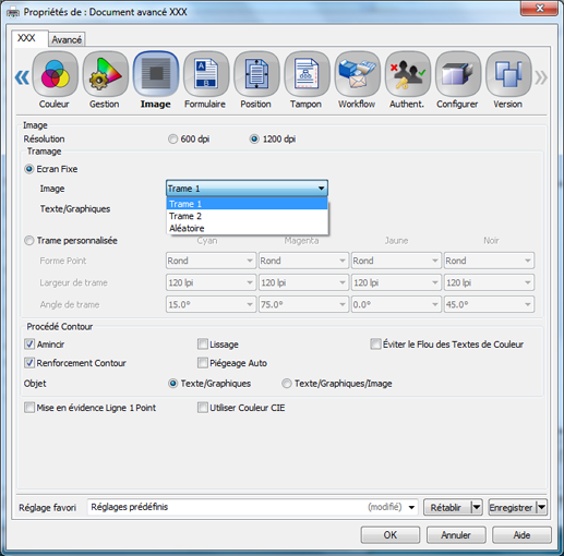 La sélection de [Trame personnalisée] permet d'accéder à des réglages avancés : forme du point, nombre de lignes et angle de trame. (Voir Trame personnalisée : sélection du type de trame.)