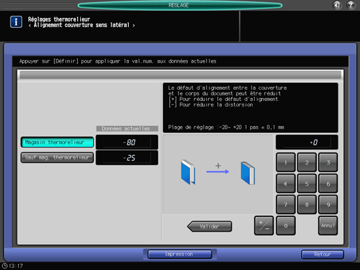 Appuyez sur [Magasin thermorelieur]. Entrez la valeur de réglage et appuyez sur [Valider].