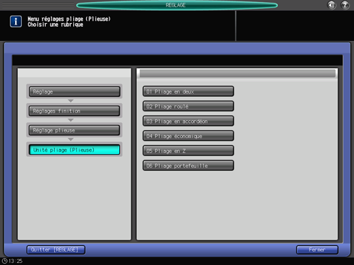 Appuyez sur [Unité pliage (Plieuse)] dans le menu [Réglages plieuse].